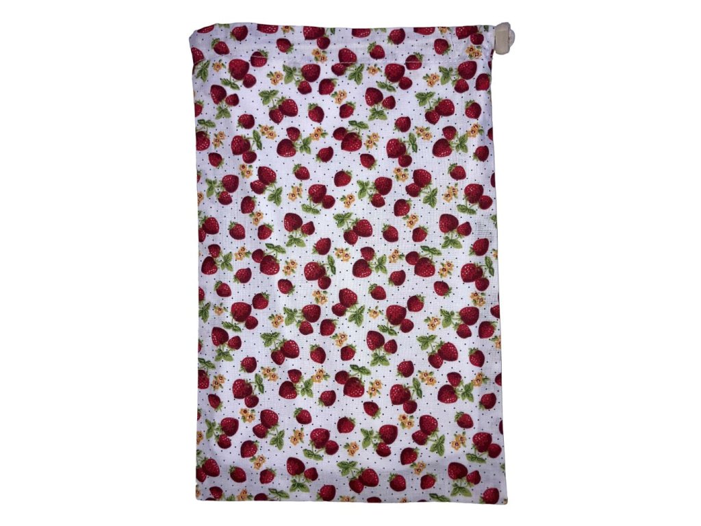 Behúzós kenyeres zsák – epres mintás, pamut és PUL bélés Pamut külső, PUL bélés, vízálló-légáteresztő, zsinóros zárás