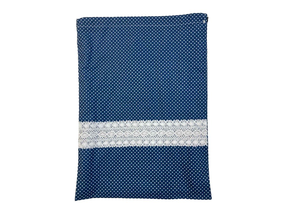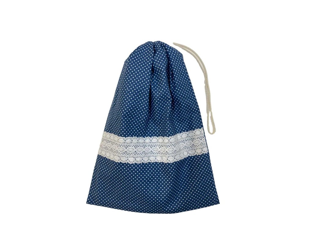 Behúzós kenyeres zsák – kék alapon fehér pöttyös, csipkebetéttel