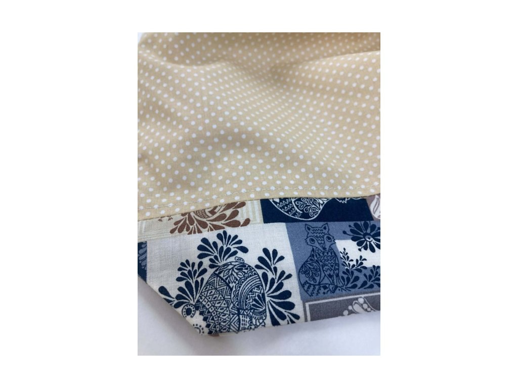 Ez a 30×40 cm-es kenyérzsák a természet ihlette mintáival és praktikus kialakításával ideális választás a tudatos háztartásokba. A bézs alapon pöttyös felső rész letisztult megjelenést ad, míg az alsó patchwork rész játékos állatfigurákkal (rókák, baglyok) és virágmintákkal díszített.