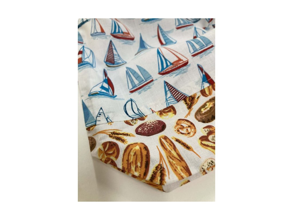 Ez a frissentartó kenyereszsák stílusos és praktikus kiegészítője a konyhának. A felső rész vitorlás mintájú pamutvászonból készült, az alsó rész pedig kenyérmotívumos anyagból.
