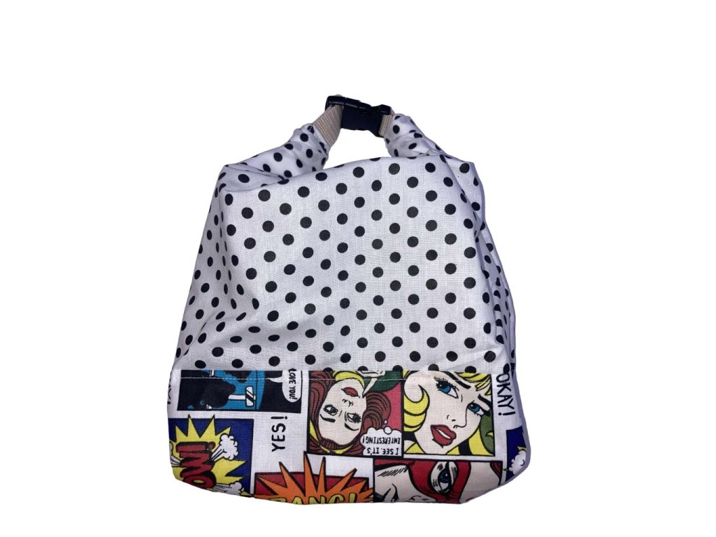 Ez a fehér alapon fekete pöttyös pamut füles zsák vidám képregény mintás szegéllyel különleges és trendi kiegészítője a mindennapoknak. PUL bélése gondoskodik arról, hogy a kenyér és más pékáruk tovább frissen maradjanak. Strapabíró, higiénikus és mosógépben mosható, így hosszú távú, környezetbarát megoldást kínál. Csatos zárral könnyen kezelhető, és biztonságos a használata. Nemcsak kenyértárolásra, hanem uzsonnás- vagy tárolózsákként is tökéletes. Stílusos és fenntartható alternatíva a műanyag tasakok helyett.