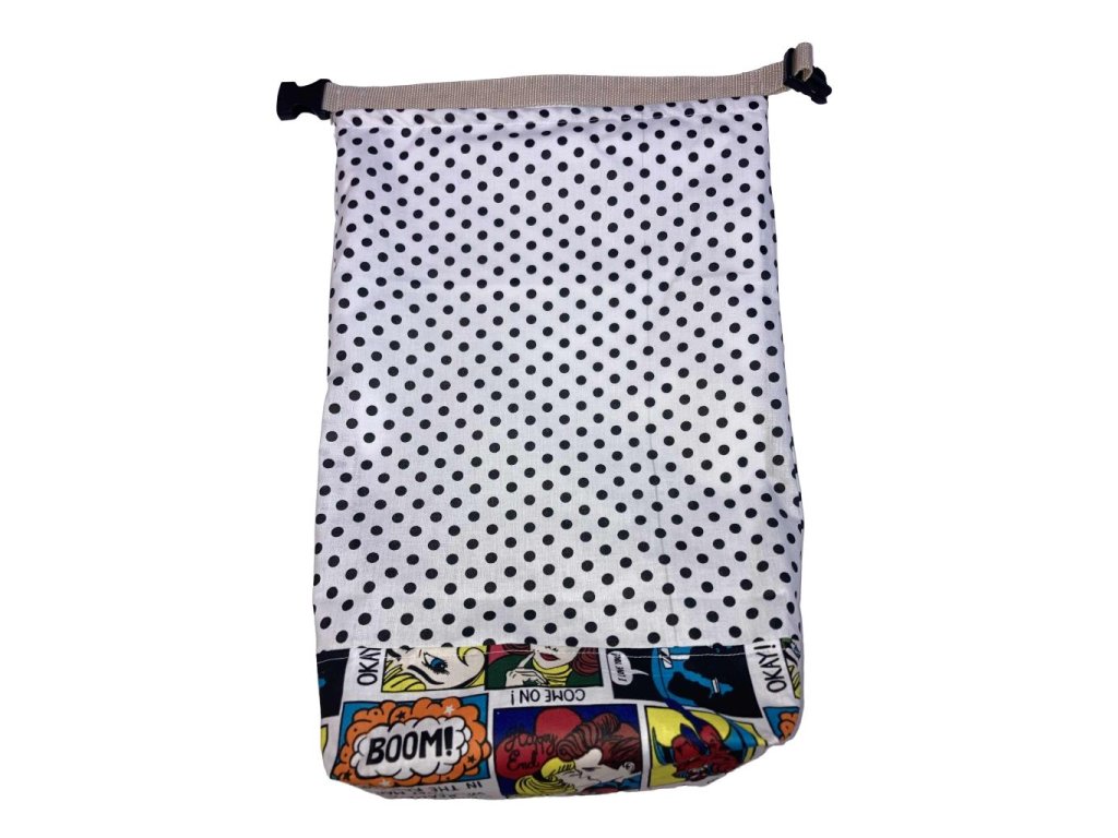 Füles kenyeres zsák – fehér alapon fekete pöttyös képregény mintás szegéllyel, PUL béléssel