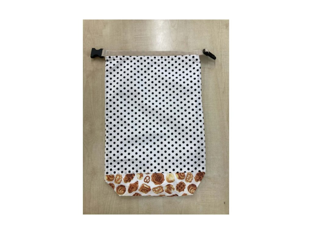 A felső rész modern, fekete pöttyös mintát kapott, az alsó részen pedig pékáru minták díszítik a zsákot – így nem csak praktikus, de stílusos kiegészítő is a konyhában.
