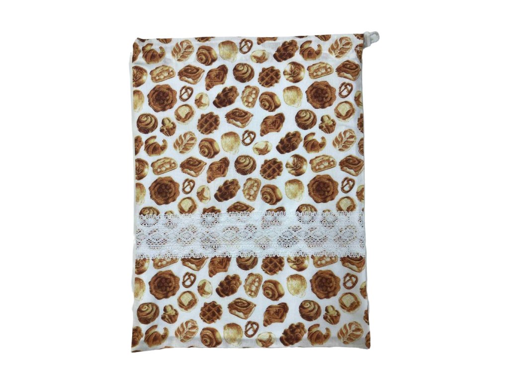 Ez a csipkebetétes, péksütemény mintás kis cipós zsák ideális választás mindazoknak, akik szeretik a praktikus és esztétikus tárolási megoldásokat. A pamut külső természetesen szellőzik, míg a PUL bélés gondoskodik arról, hogy a kenyér és más pékáruk hosszabb ideig frissek maradjanak.