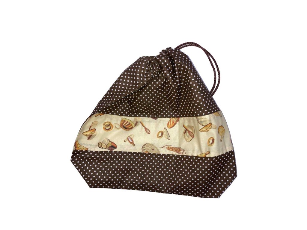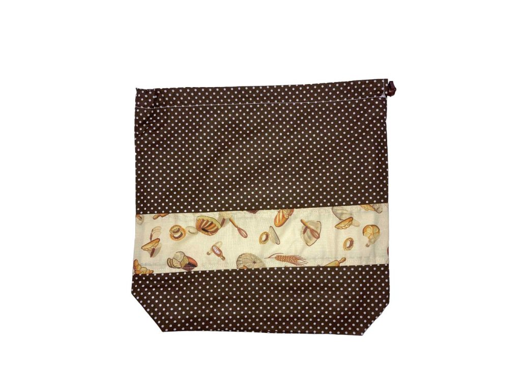Ez a barna pöttyös mintás, pékáru motívumokkal díszített kis cipószsák egyedi és praktikus választás a mindennapi kenyér- és péksütemény tárolásához. Strapabíró pamut anyagból készült, amely könnyen mosható és többször használható, így környezetbarát alternatívát nyújt a műanyag zacskók helyett. A különleges pékáru mintás betét igazán hangulatos megjelenést biztosít. A behúzózár könnyű használatot garantál, miközben frissen tartja a cipót, kiflit vagy zsemlét.