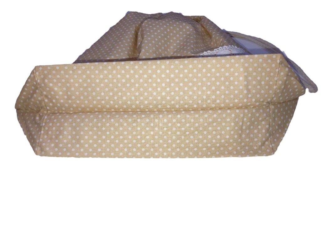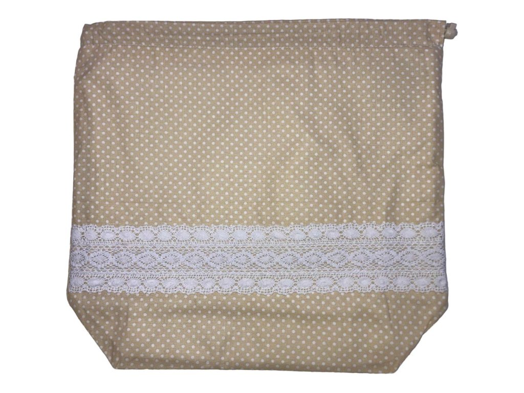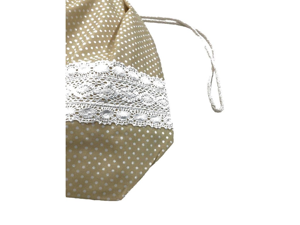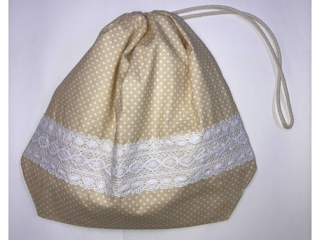 Ez a bézs alapon pöttyös, fehér csipkével díszített kis cipószsák elegáns és egyedi megjelenést kínál. Kiváló választás kisebb cipók, zsemlék vagy egyéb pékáruk tárolására. Strapabíró, mosható pamut anyagból készült, amely hosszú távon fenntartható alternatívát nyújt az egyszer használatos műanyag zacskókkal szemben. A praktikus behúzózár segít a frissesség megőrzésében, miközben könnyen kezelhető és dekoratív kiegészítője a konyhának.