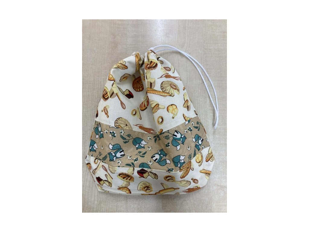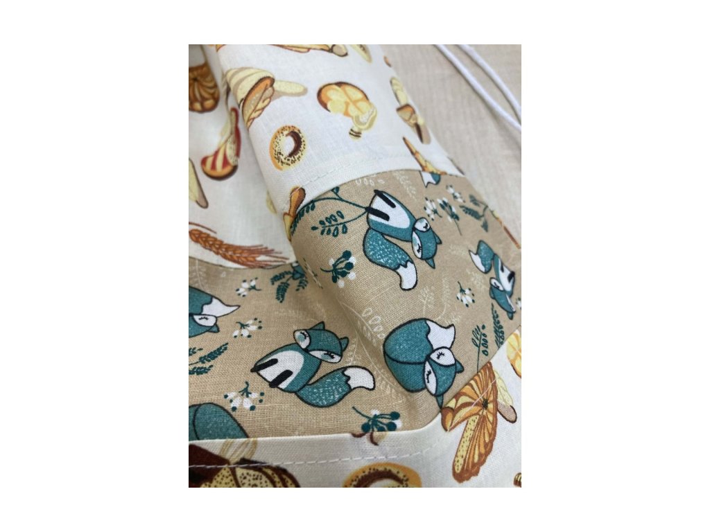 A felső és alsó rész klasszikus péksütemény mintás textilből készült, középen pedig egy egyedi rókás pamutvászon betét díszíti, amely különlegessé teszi ezt a darabot. A zsák behúzózsinórral záródik, így egyszerűen nyitható és biztonságosan hordható.