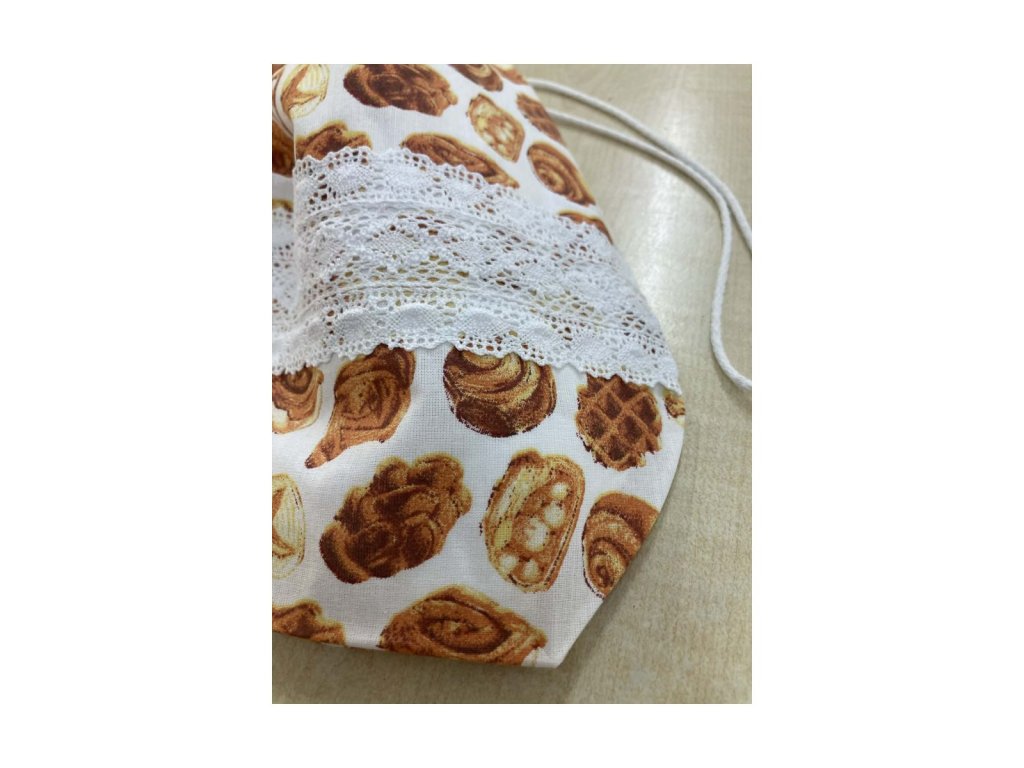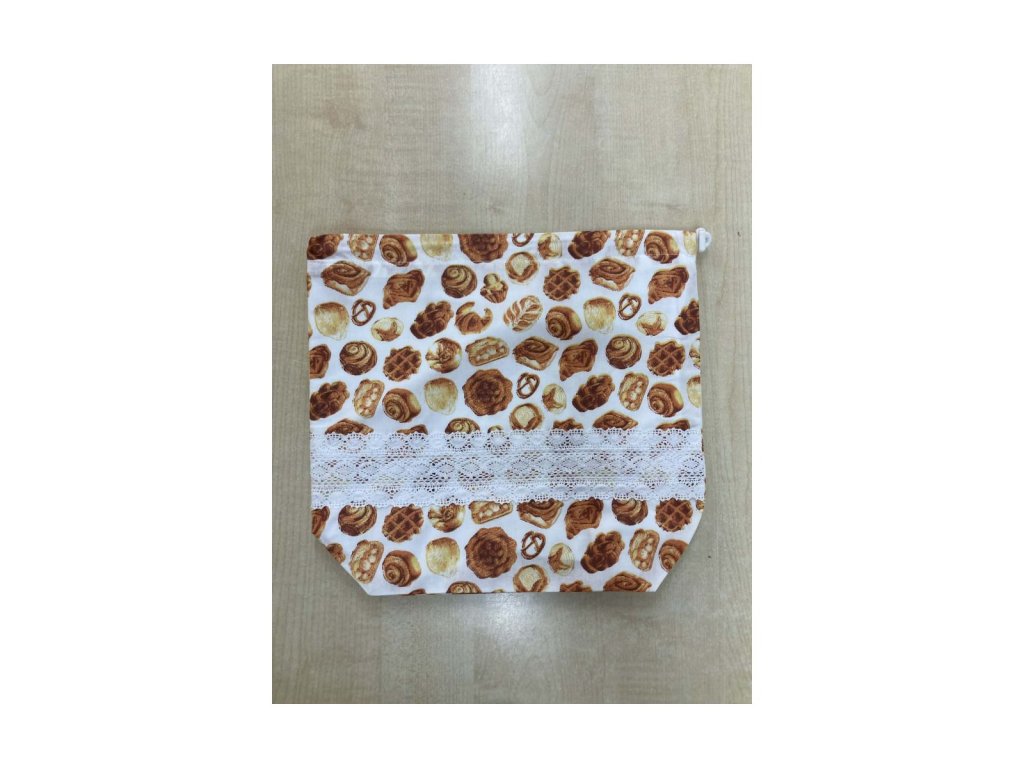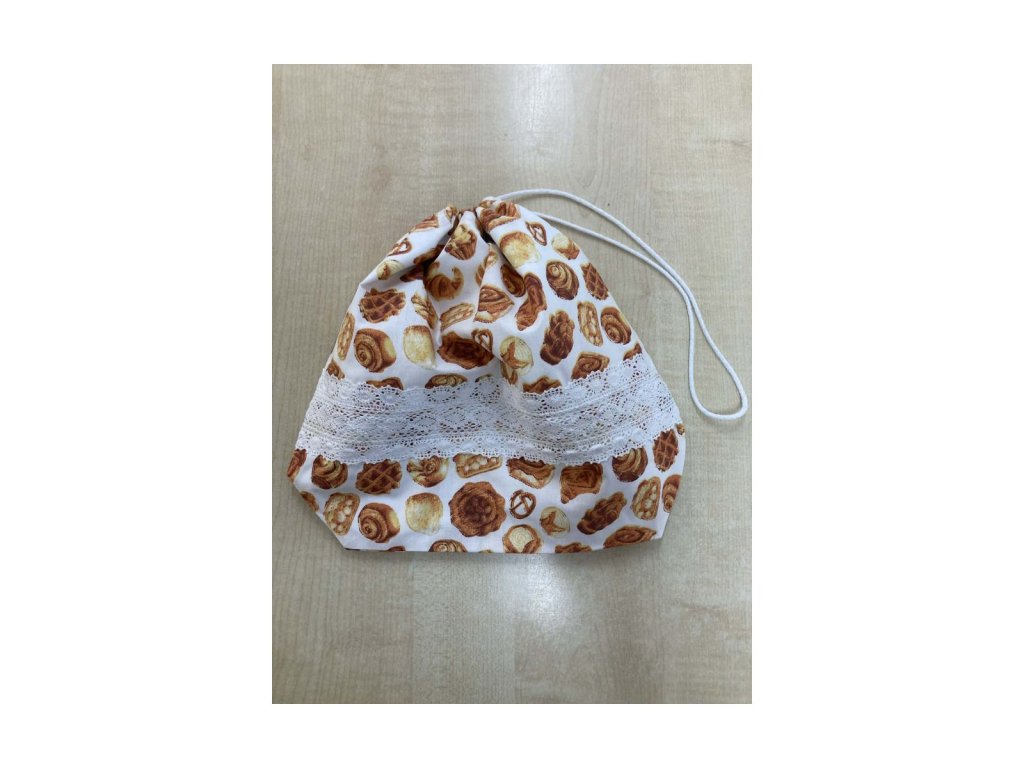 Kiscipós mintás kenyeres zsák csipkével – pamut, zsinóros Praktikus tároló ovis és iskolai használatra.