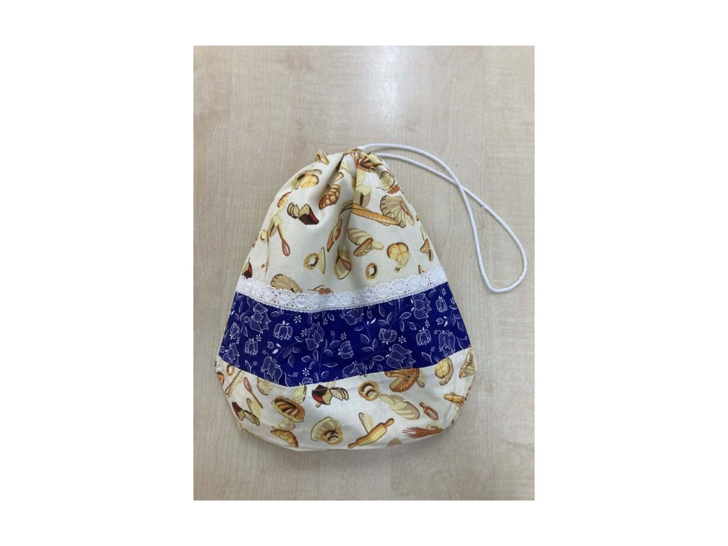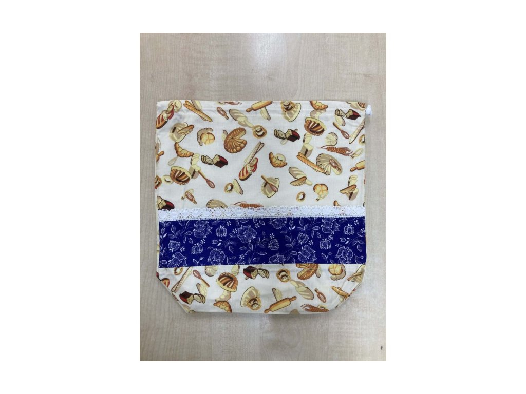 Kiscipós zsák kék virágmintás betéttel Egyedi péksütemény mintás textil zsák csipkével