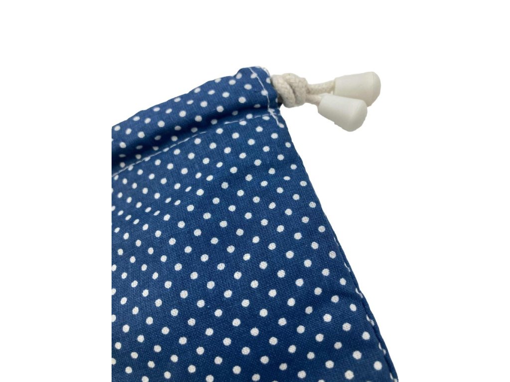 Ez a kék alapon fehér pöttyös, csipkebetéttel díszített nagy cipós zsák elegáns és romantikus megjelenést biztosít. Tágas mérete lehetővé teszi, hogy akár egy nagyobb cipót vagy többféle pékárut kényelmesen tárolj benne. Kiváló választás azok számára, akik nemcsak a praktikumot, hanem a stílust is fontosnak tartják. A strapabíró pamut anyag könnyen tisztítható és hosszú ideig használható, miközben segít csökkenteni az egyszer használatos csomagolások mennyiségét. A behúzózárnak köszönhetően gyorsan nyitható és biztonságosan zárható, így a kenyér tovább friss marad.