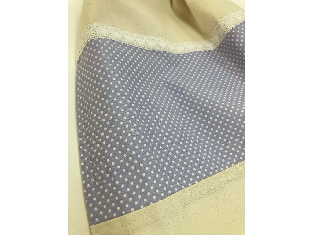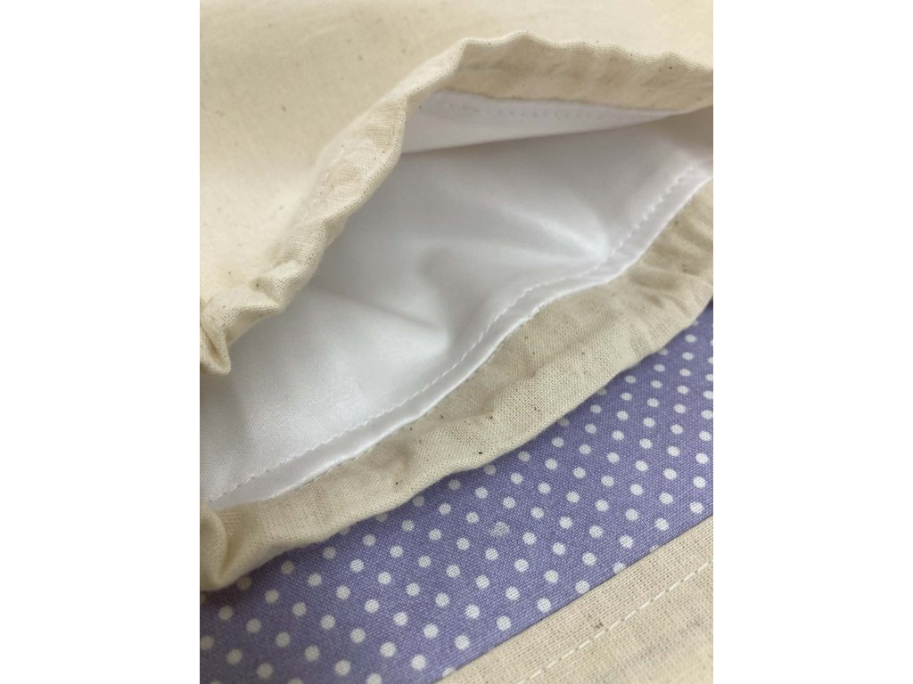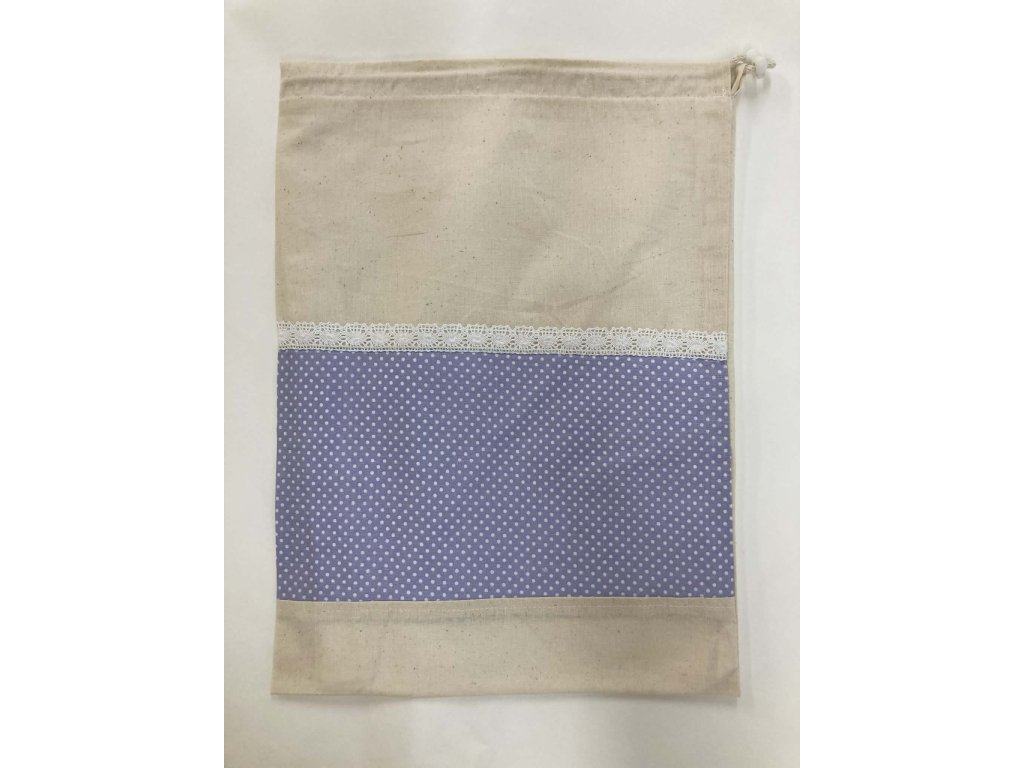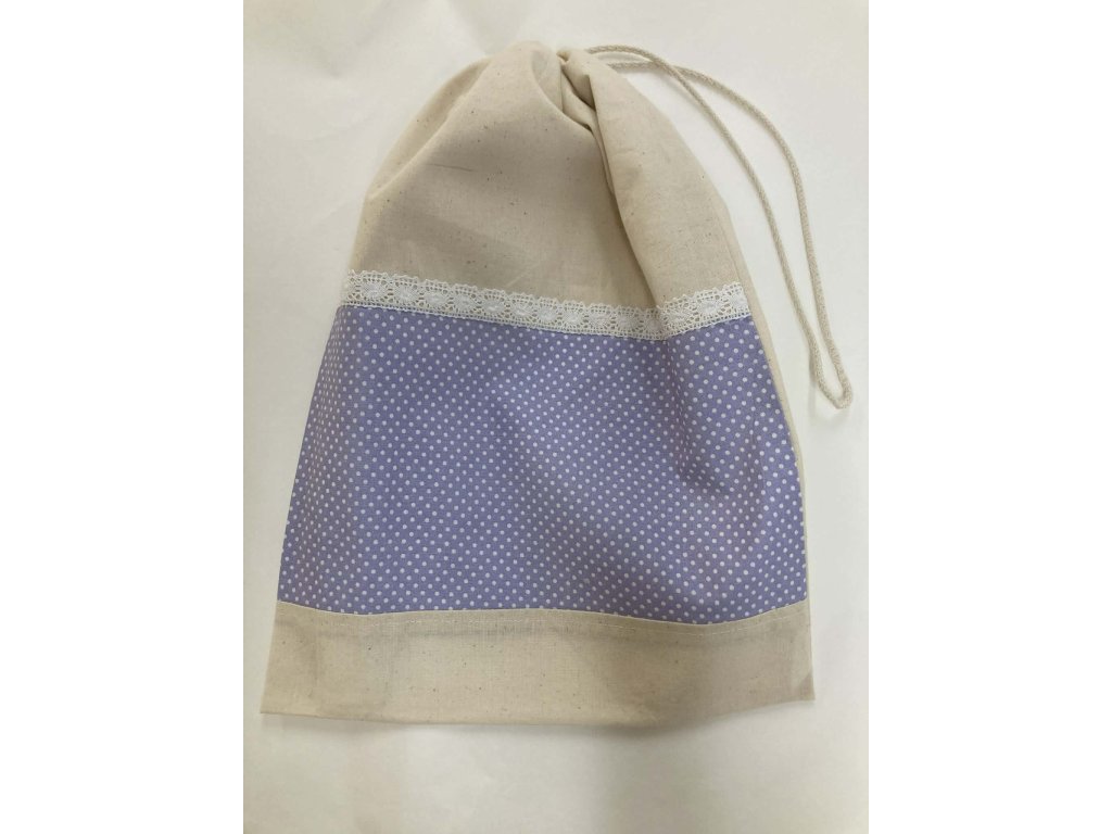 Ez a kézzel készült textil zsák ideális választás mindennapi tároláshoz és utazáshoz. A felső rész natúr pamutból készült, alján pedig lila pöttyös mintás anyag kapott helyet, amelyet finom fehér csipke díszít.