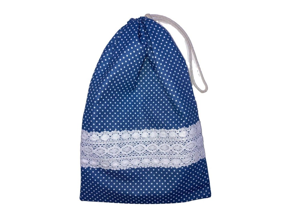 Uzsonnás zsák – kék alapon fehér pöttyös, csipkebetéttel